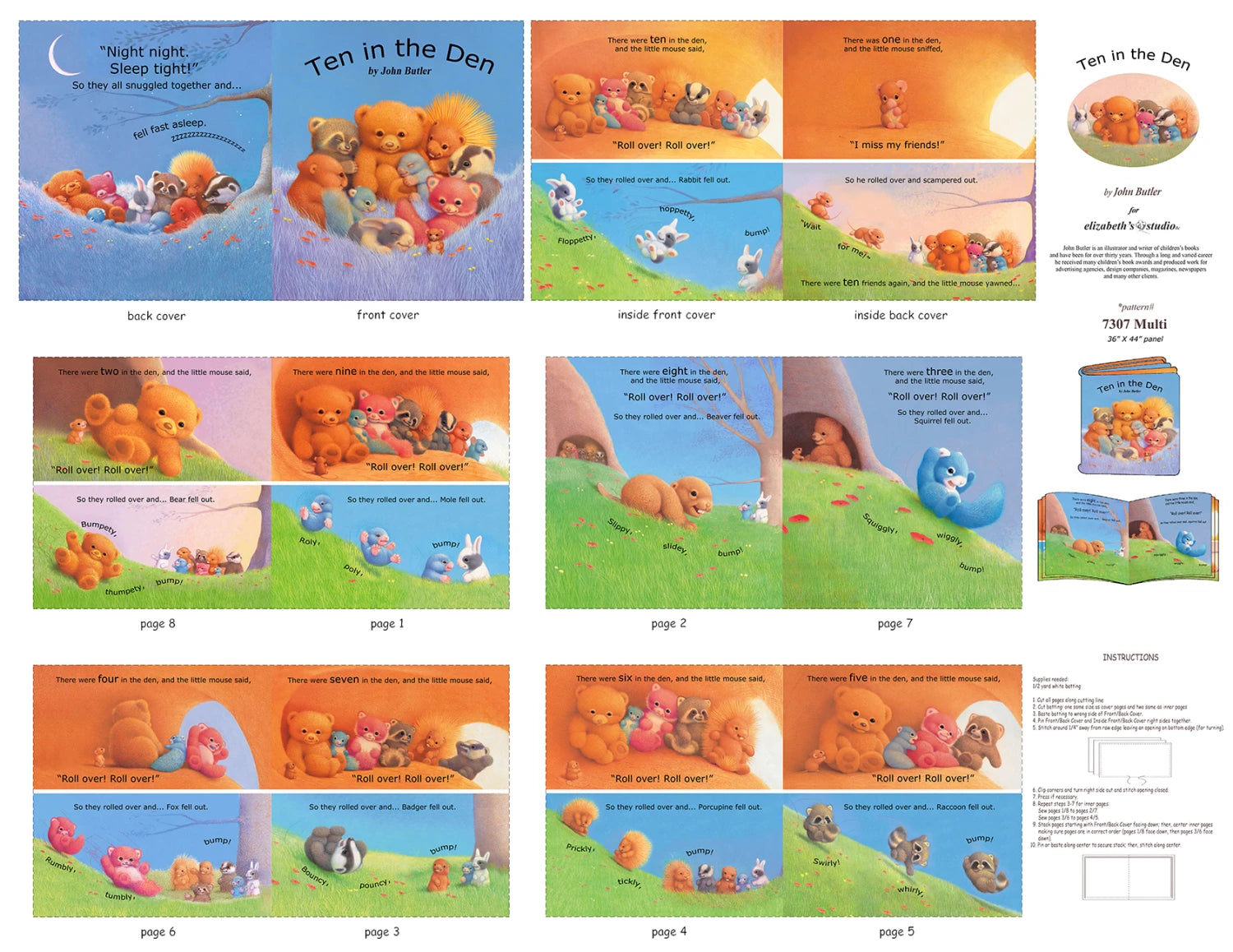 36" by 44" Ten in the Den Book panel comes with complete instructions printed on the panel, all you need in addition to the panel is 1 yard med. weight batting. Finished size of the book is approx. 9" by 8-1/2"