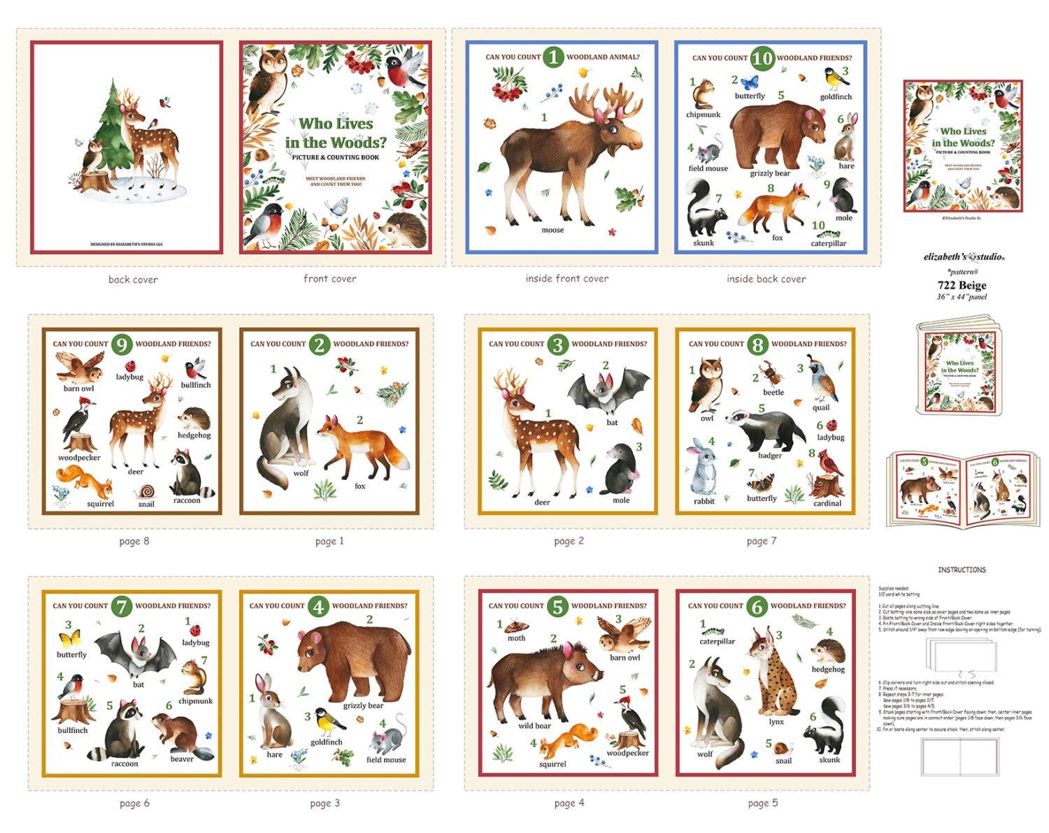 36" by 44" Who Live in the Woods Book panel comes with complete instructions printed on the panel, all you need in addition to the panel is 1 yard med. weight batting. Finished size of the book is approx. 9" by 8-1/2"