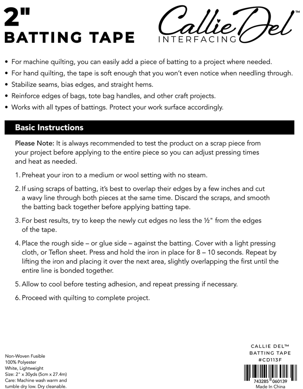 The 2” batting tape from Callie Del® is the perfect solution for joining two or more pieces of batting together on your larger quilts. This lightweight stabilizer won’t gum up your machine, or add bulk to your project.