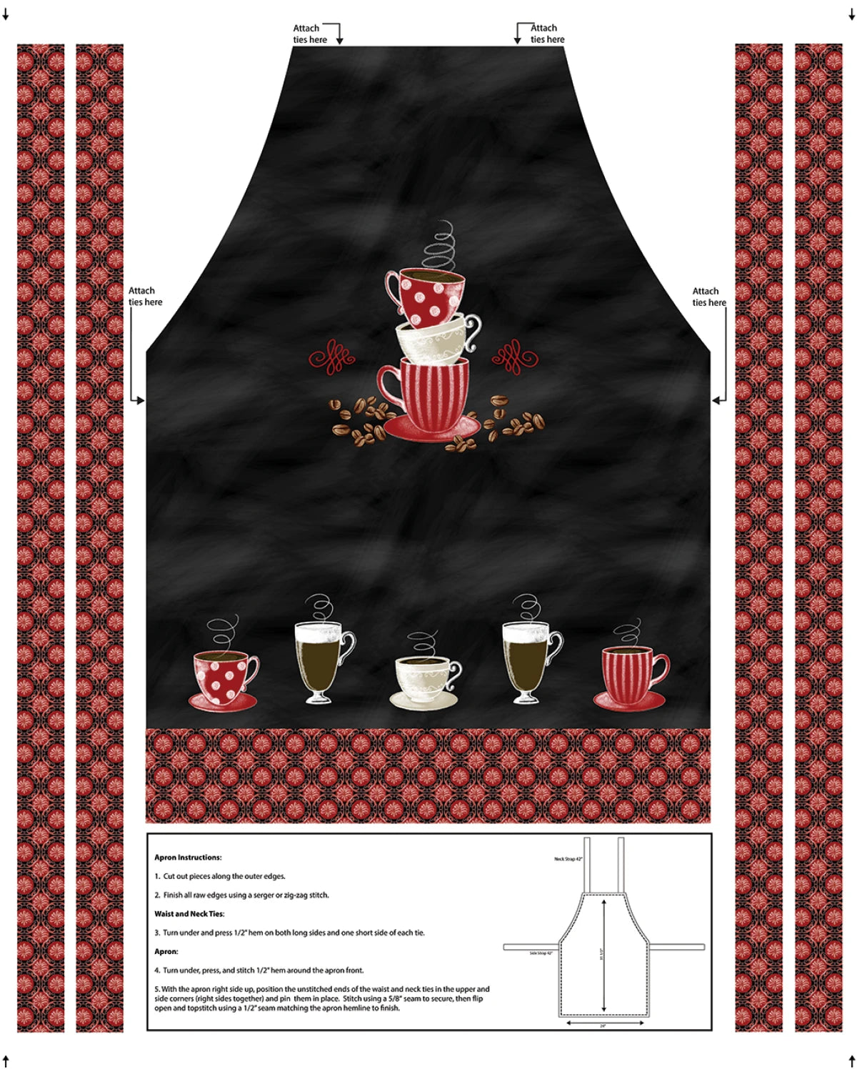 This charming fabric features a delightful design perfect for coffee lovers. The main body showcases a black background with an array of coffee cups in various styles, some with steam rising playfully, set against a scattering of coffee beans. The border is adorned with a red and black pattern that complements the central theme, creating a cohesive and visually appealing apron panel. This fabric is not only ideal for crafting aprons but also for any project that needs a touch of whimsy and warmth.