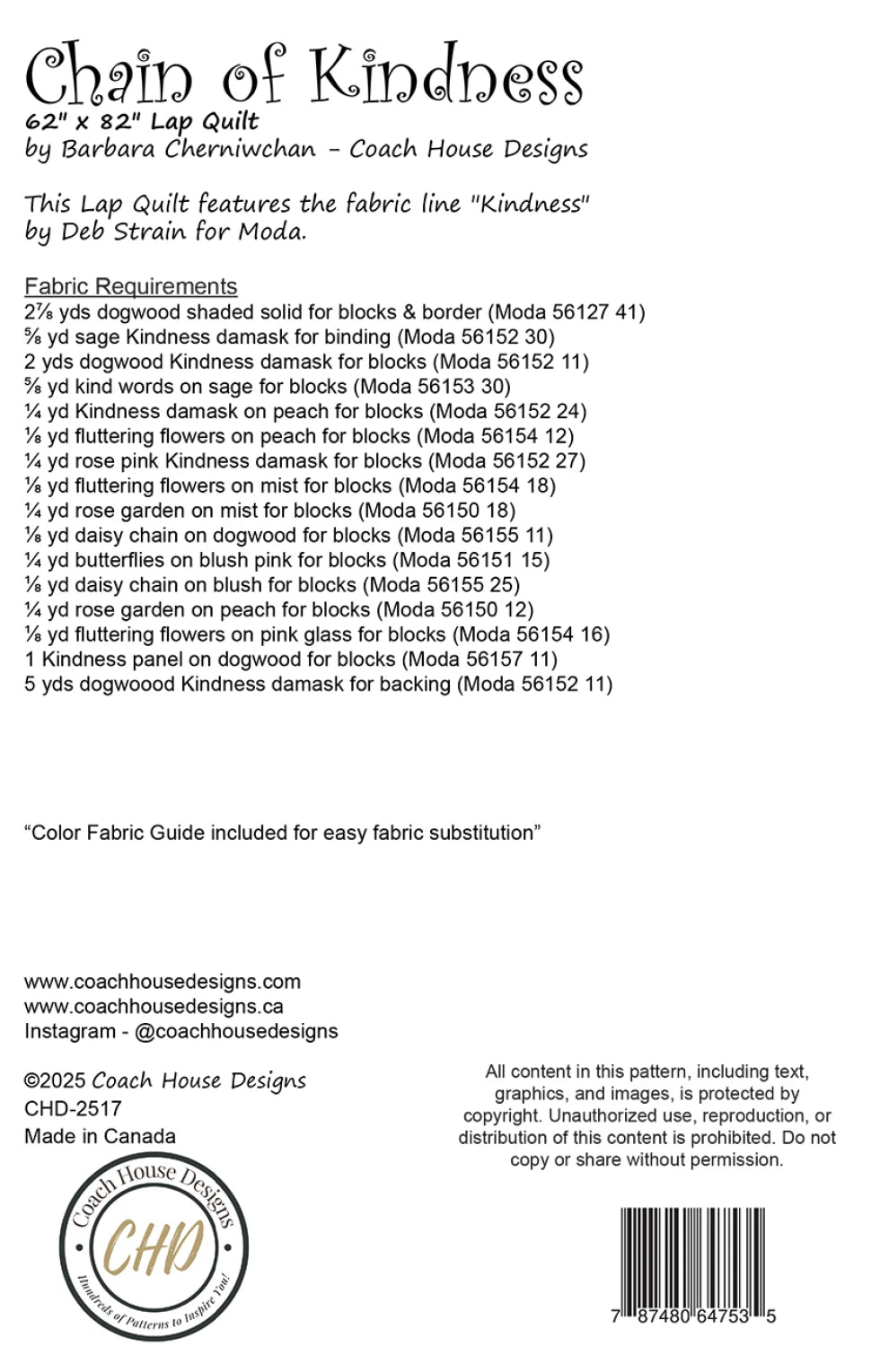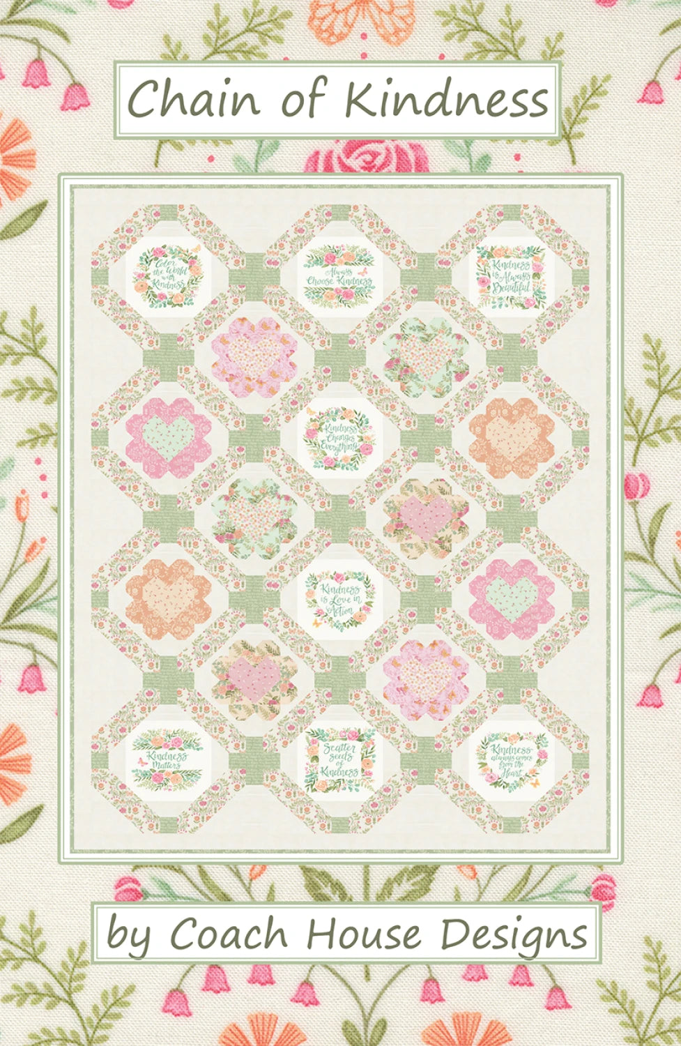 This 62" x 82" lap quilt features Kindness by Deb Strain and uses the dogwood Kindness Panel. The quilt blocks look like they are set on a diagonal in chain setting blocks. The quilt also includes a heart/flower combination block which is set among the panel blocks. Each panel contains a lovely sentiment about kindness.