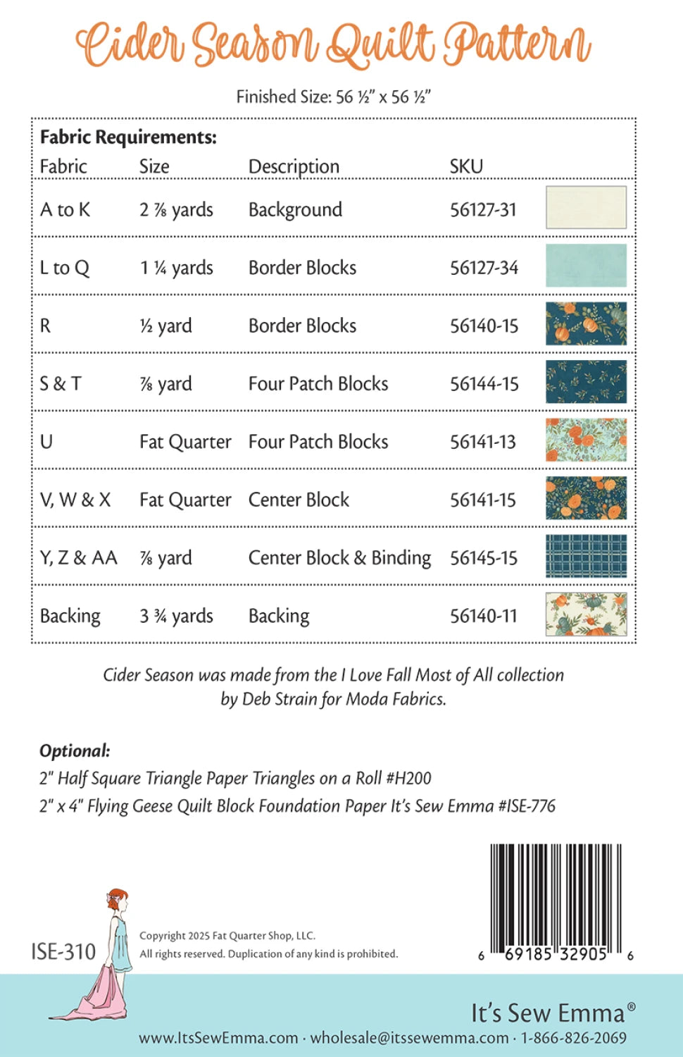 Cider Season by It’s Sew Emma celebrates the arrival of fall. This medallion quilt features stars and maple leaves in a mix of blues and creams with touches of golden orange, beautifully capturing the crisp fall weather. Cider Season features Deb Strain's I Love Fall Most of All collection for Moda Fabrics.