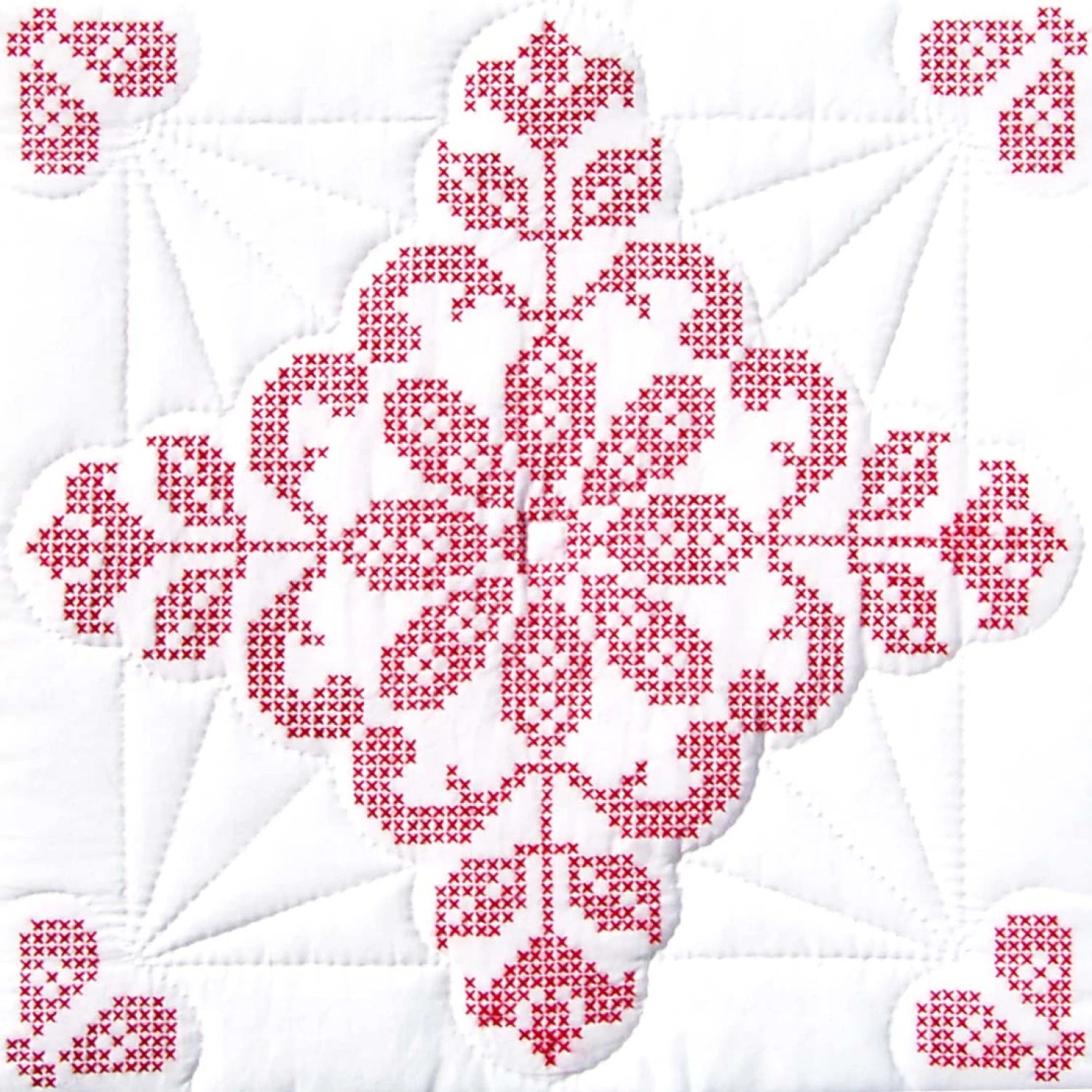 Cross Stitch only design, with quilting marks. Each package contains six – 18 in x 18in quilt blocks of cotton/poly broadcloth. Additional materials needed to complete: Backing, batting, hoop, needle, floss and thread. Floss requirements included.