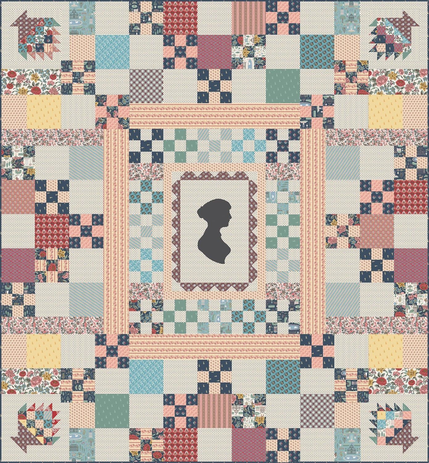 This quilt kit features a charming design centered around a silhouette of a woman, reminiscent of classic literature, framed by a patchwork of various patterns and colors. The quilt showcases a harmonious blend of soft pastels and floral prints, with a mix of geometric and traditional quilting blocks. The central silhouette is surrounded by a border of checkered and striped patterns, creating a visually appealing contrast that highlights the intricate details of each fabric piece. Ideal for both traditional quilters and modern crafters, this kit provides all the materials needed to create a beautifully detailed quilt.