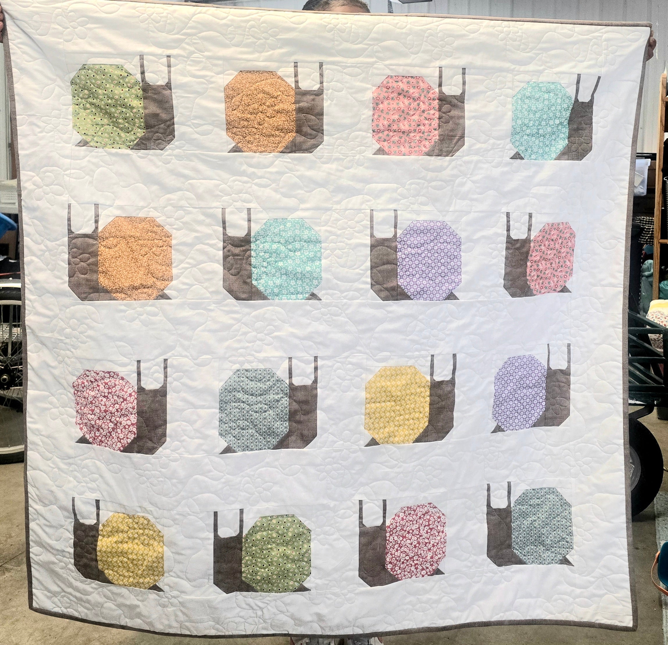 The "Garden Snails" baby quilt is a mini of the original version and made with the same pattern but pieced with only 4 snails going across and 4 down. Kit includes all fabric for the top and binding. This quilt uses adorable 30's reproductions fabrics from multiple brands for a sweet little vintage twist! Fabric I used for the backing can be found here.
