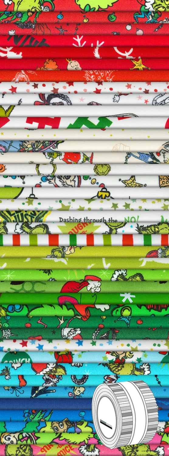 This delightful fabric set features 2.5-inch strips of 100% cotton, each adorned with vibrant scenes and characters from the beloved story "How the Grinch Stole Christmas". The design showcases a colorful array of illustrations including the Grinch, Max, and various festive elements like Christmas trees and ornaments, all in a whimsical, cartoon style. Perfect for quilting, crafting, or creating holiday-themed projects, this set brings a playful and festive touch to any project, making it ideal for both personal and commercial use.