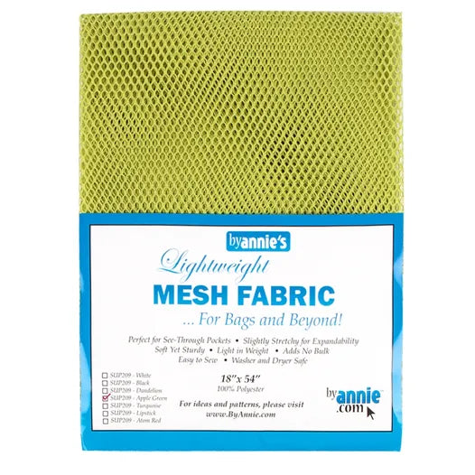 Lightweight and a bit stretchy, this mesh is fabulous! Perfect for pockets on bags or anywhere you want to be able to see what you are storing, the mesh also works great in various garment applications and utility needs. To help you sew, the mesh is specially coated to be less slippery and easy to work with, while still being soft and pliable.