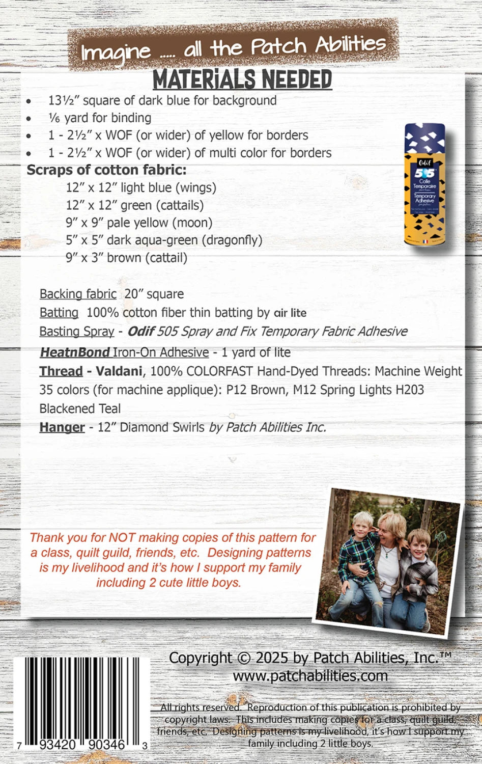 "June in Monthly Minis series 16, this block of the month pattern series offers a beginner friendly combination of applique and piecing. A dragonfly among cattails under a full moon is made easy using traditional raw edge applique with fusible web. This 6" x 9" pattern offers a block of the month stand alone wall hanging quilt measuring 16.5" square.