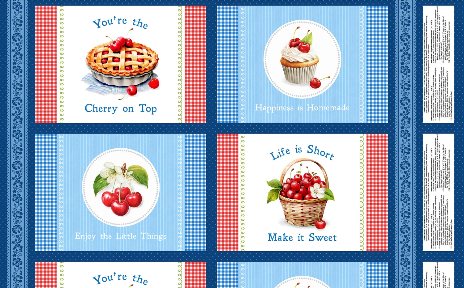 This charming fabric panel features a delightful assortment of cherry-themed designs, perfect for creating placemats or other home decor items. The design includes four distinct squares, each with a unique illustration: a cherry pie with the phrase "You're the Cherry on Top," a cupcake with "Happiness is Homemade," a basket of cherries with "Make it Sweet," and a single cherry with "Enjoy the Little Things." The background alternates between blue and red gingham patterns, adding a classic touch to the modern sayings. The border features a detailed cherry motif, enhancing the overall aesthetic.