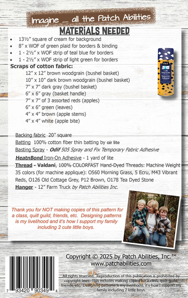 "September in Monthly Minis series 16, this block of the month pattern series offers a beginner friendly combination of applique and piecing. A bushel basket of apples are made easy using traditional raw edge applique with fusible web. This 6" x 9" pattern offers a block of the month stand alone wall hanging quilt measuring 16.5" square.
