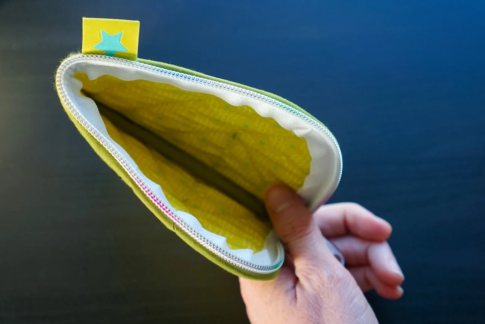 A curved zipper pouch that starts from a folded rectangle, creating a sleek, structured silhouette.