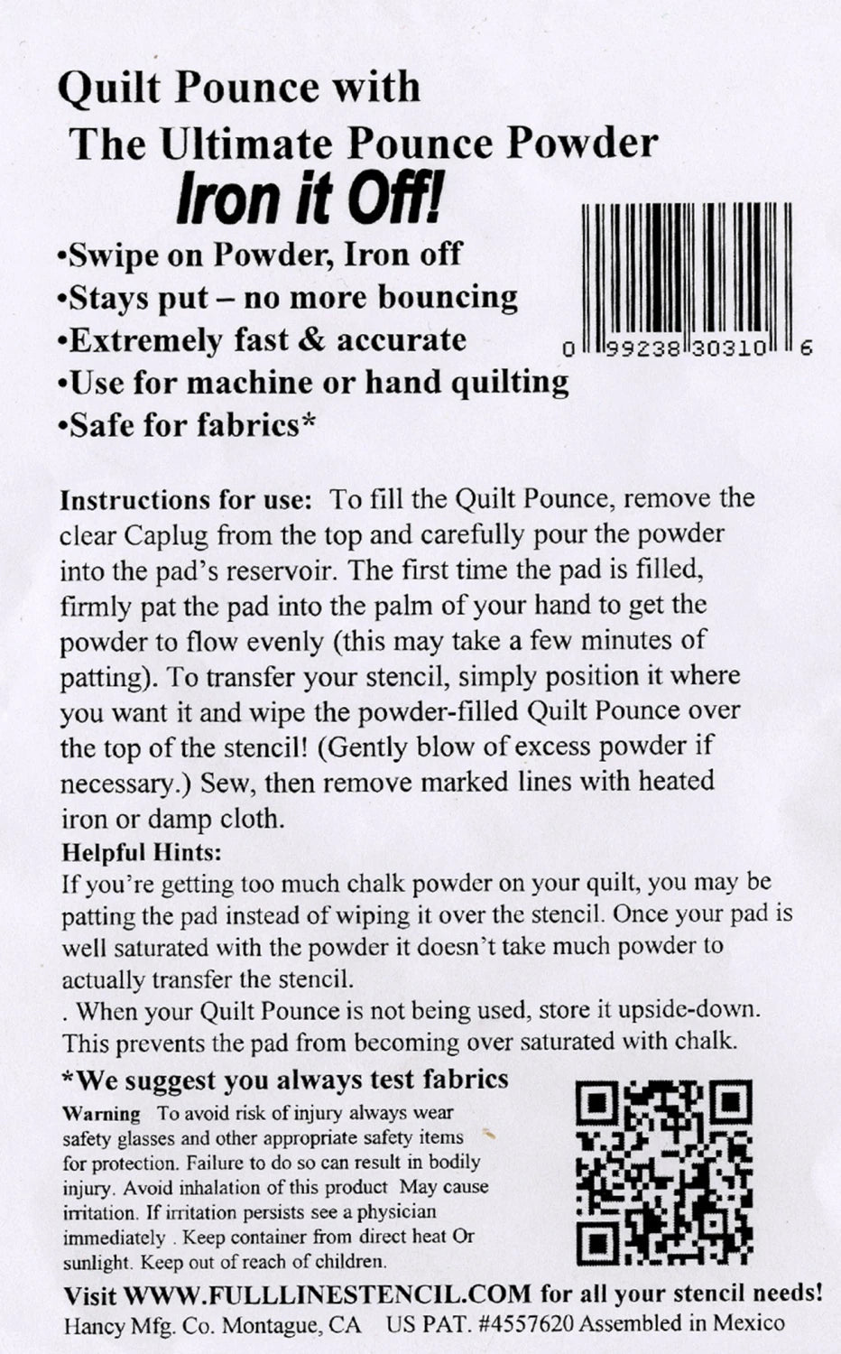 Never before has marking quilts been easier than with our Ultimate Iron-off Pounce Powder! The Quilt Pounce applies it like any other type of chalk or powder to easily and instantly transfer your stencil design. The Ultimate Pounce Powder adheres exceptionally well with minimal bouncing when sewing along the transferred stencil lines. Best of all, when you’re done following your design, you simply run your heated iron over the pattern and it disappears without a trace. Available in white only.