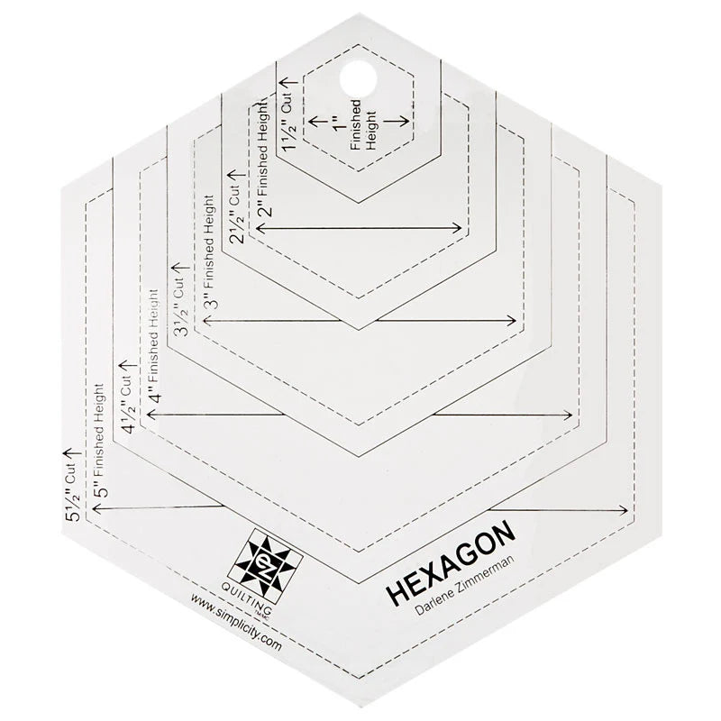 Rotary cutting template for quilting, paper arts, crafts and sewing. It has markings for 1-1/2in to 5-1/2in hexagons.