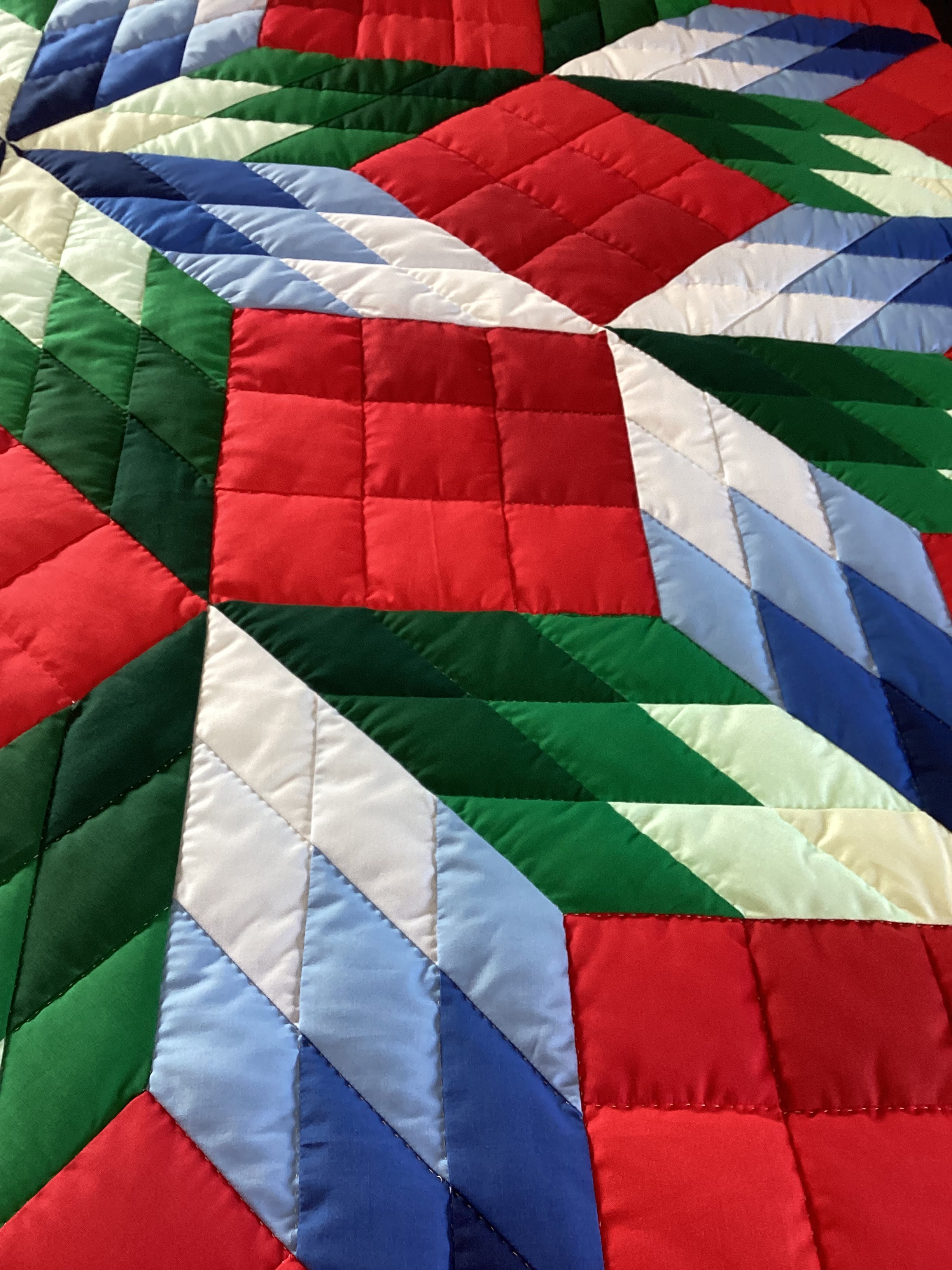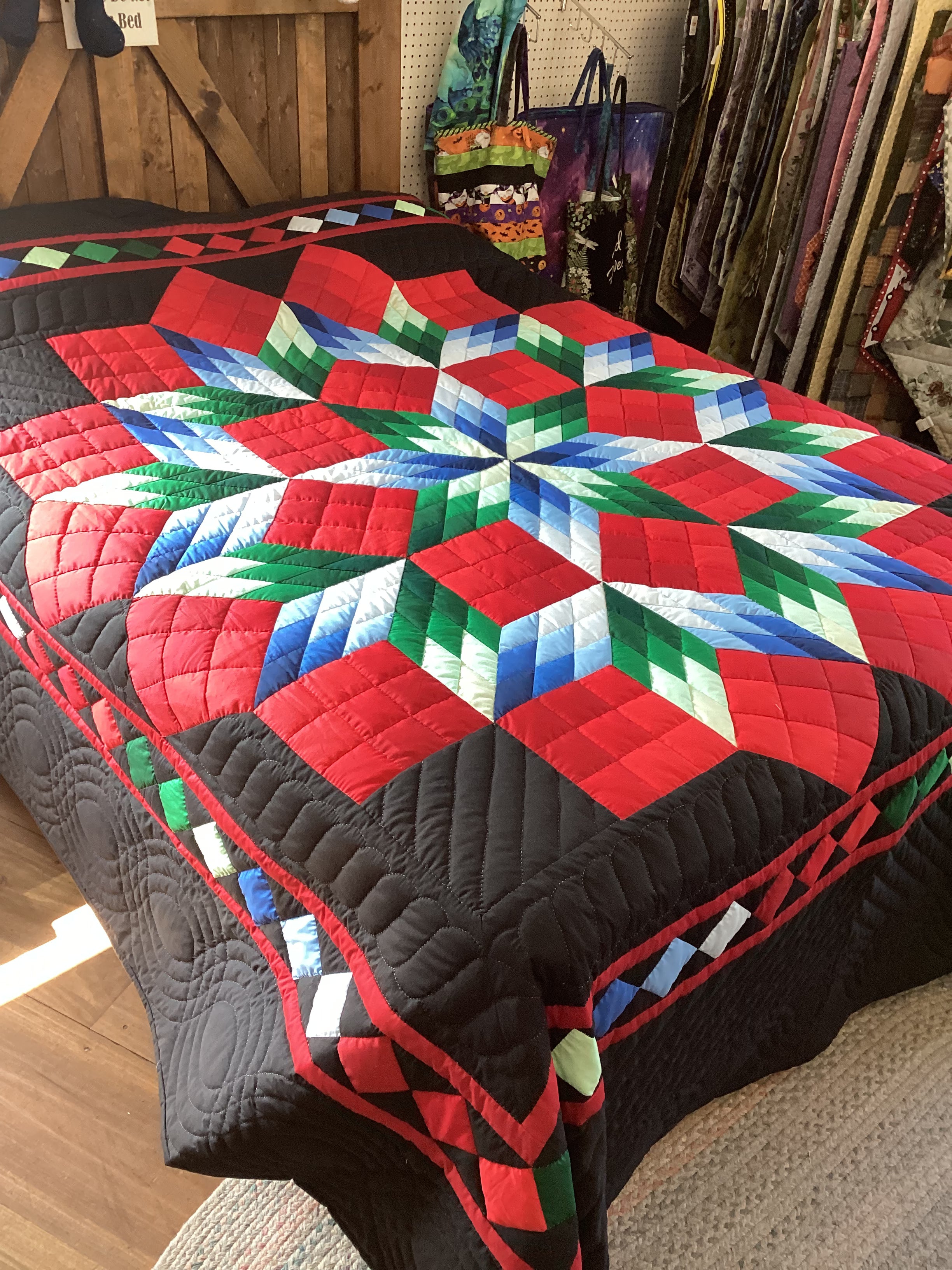 The Rubics Cube Quilt is exciting in color and design. The red blocks give it dimension and character with the blues, greens, and the black background it is a stunning Quilt.