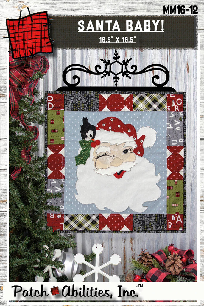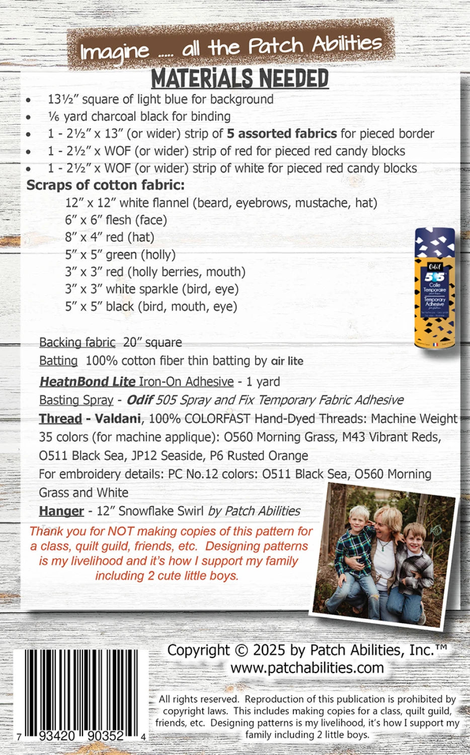 "December in Monthly Minis series 16, this block of the month pattern series offers a beginner friendly combination of applique and piecing. A classic winking Santa with a Christmas bird perched on his hat holly is made easy using traditional raw edge applique with fusible web. This 6" x 9" pattern offers a block of the month stand alone wall hanging quilt measuring 16.5" square. Hangs easily with a 12" hanger shown.