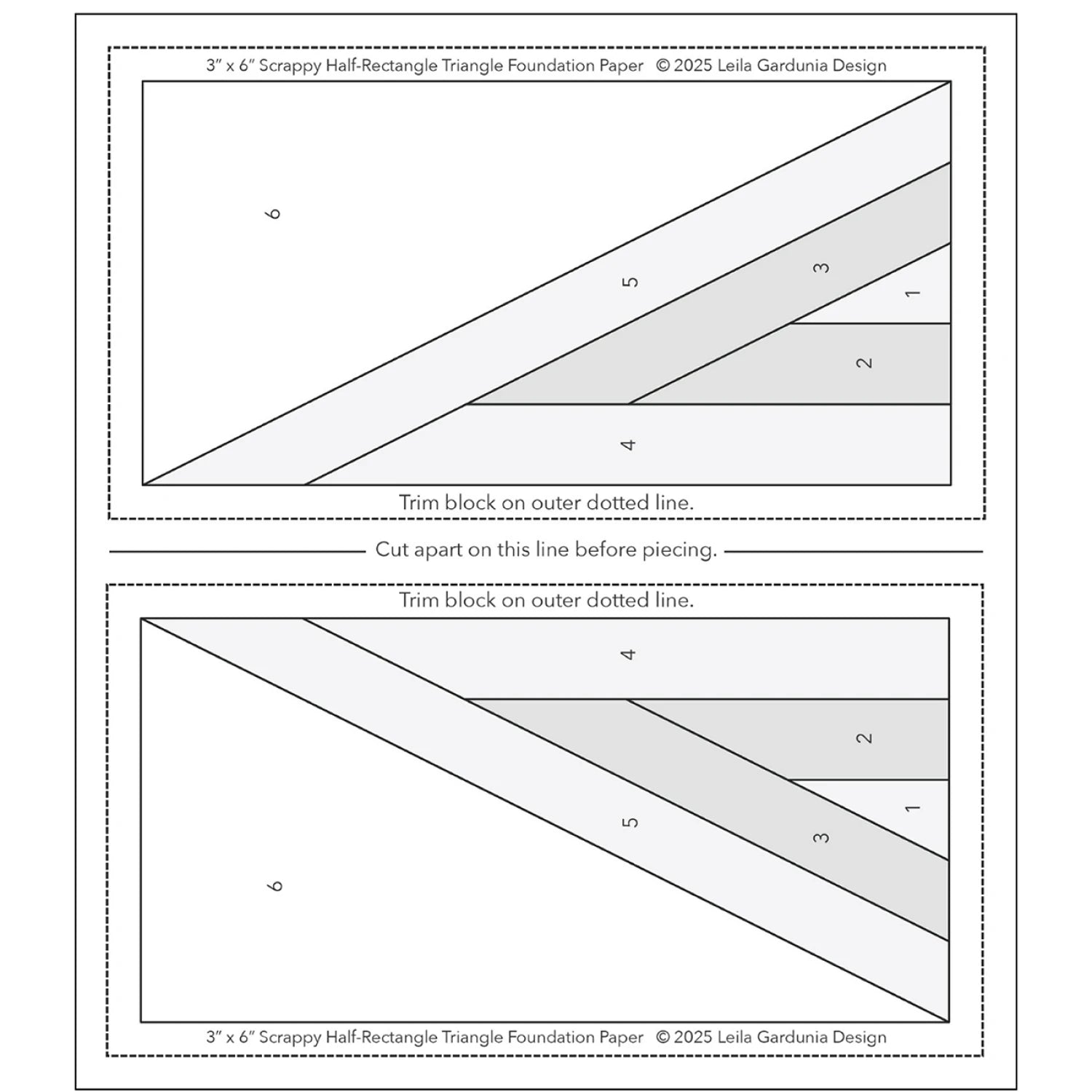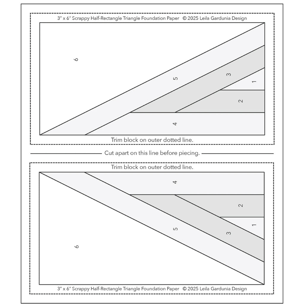 Bust through your scraps with foundation paper-pieced 3” x 6” Scrappy Half-Rectangle Triangles (HRT). This foundation pad makes it easy to choose a foundation and start sewing. No fussing with printers! The foundations are pre-printed on lightweight paper making them easy to see through and remove.