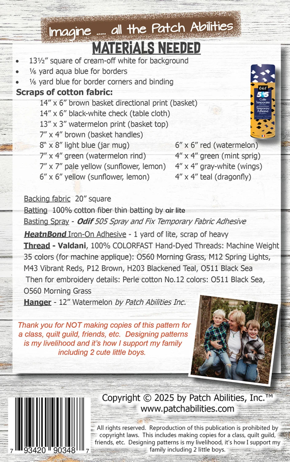 "August in Monthly Minis series 16, this block of the month pattern series offers a beginner friendly combination of applique and piecing. A summer picnic basket, watermelon slice, lemonade, lemon slice, dragonfly canning jar mug and sunflower are made easy using traditional raw edge applique with fusible web. This 6" x 9" pattern offers a block of the month stand alone wall hanging quilt measuring 16.5" square.