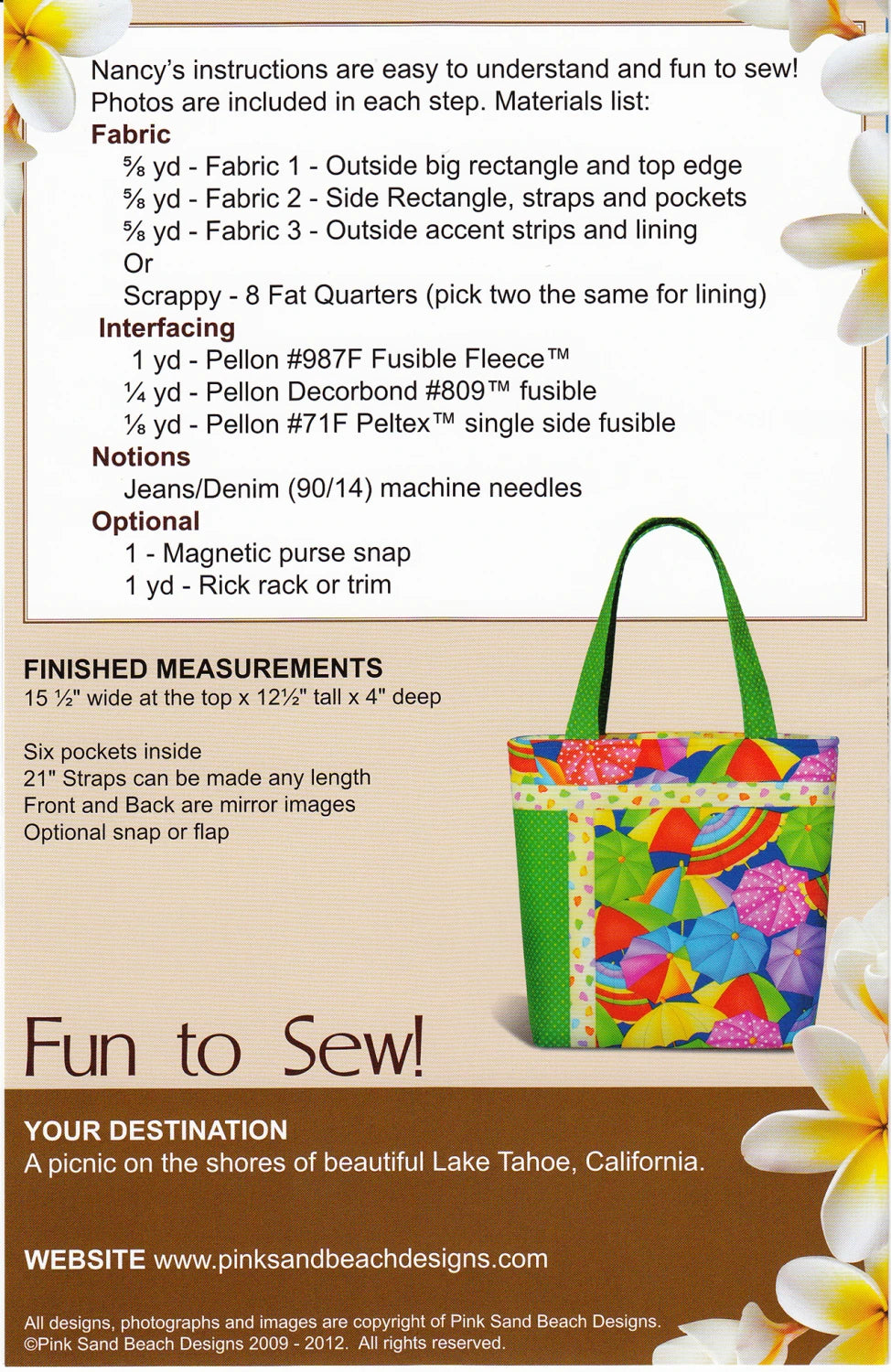 15-1/2in wide x 12-1/2in tall x 4in deep. Straps can be made any length. Lots of pockets - 6 inside. Optional snap closure. Front and back are mirror images. Fat quarter friendly.