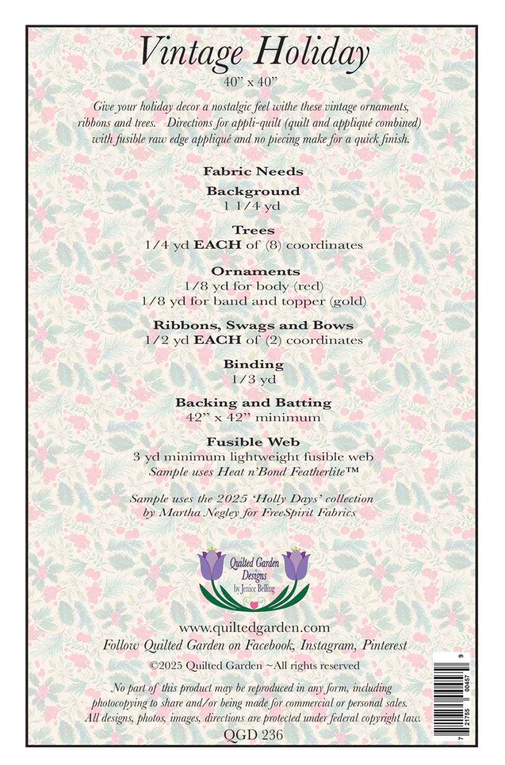 40" x 40" Give your holiday decor a nostalgic feel with these vintage ornaments, ribbons and trees. Directions for appli-quilt (quilt and appliqué combined) with fusible raw edge appliqué and no piecing make for a quick finish.