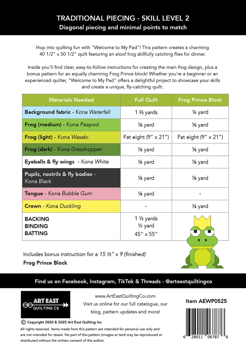 This pattern provides complete instructions for a 40 ½” x 50 ½” quilt, as seen on the cover, depicting a hungry frog catching flies. As a special bonus, instructions are included to transform your frog into a prince (no kiss needed)! The frog prince block, complete with a golden crown, finishes at 15 ½” x 19”. This project uses conventional piecing techniques (paper-piecing). With almost no points to match, this quilt is an excellent choice for beginners looking to try a precisely pieced project.