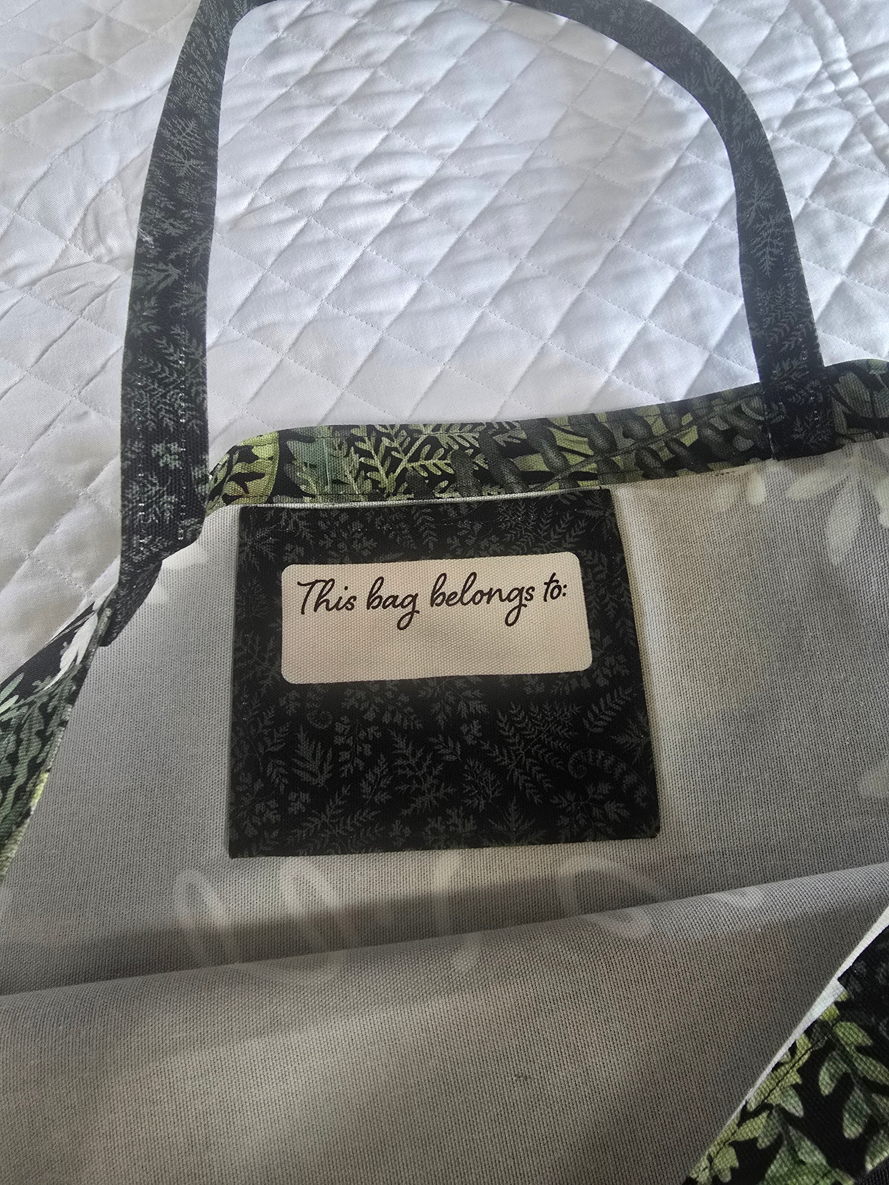 The Wild Harvest tote bag measures at 16"W x 18"H x 4"D with a 11" drop handle. It is a preprinted floral/mushroom tote with a black background.
